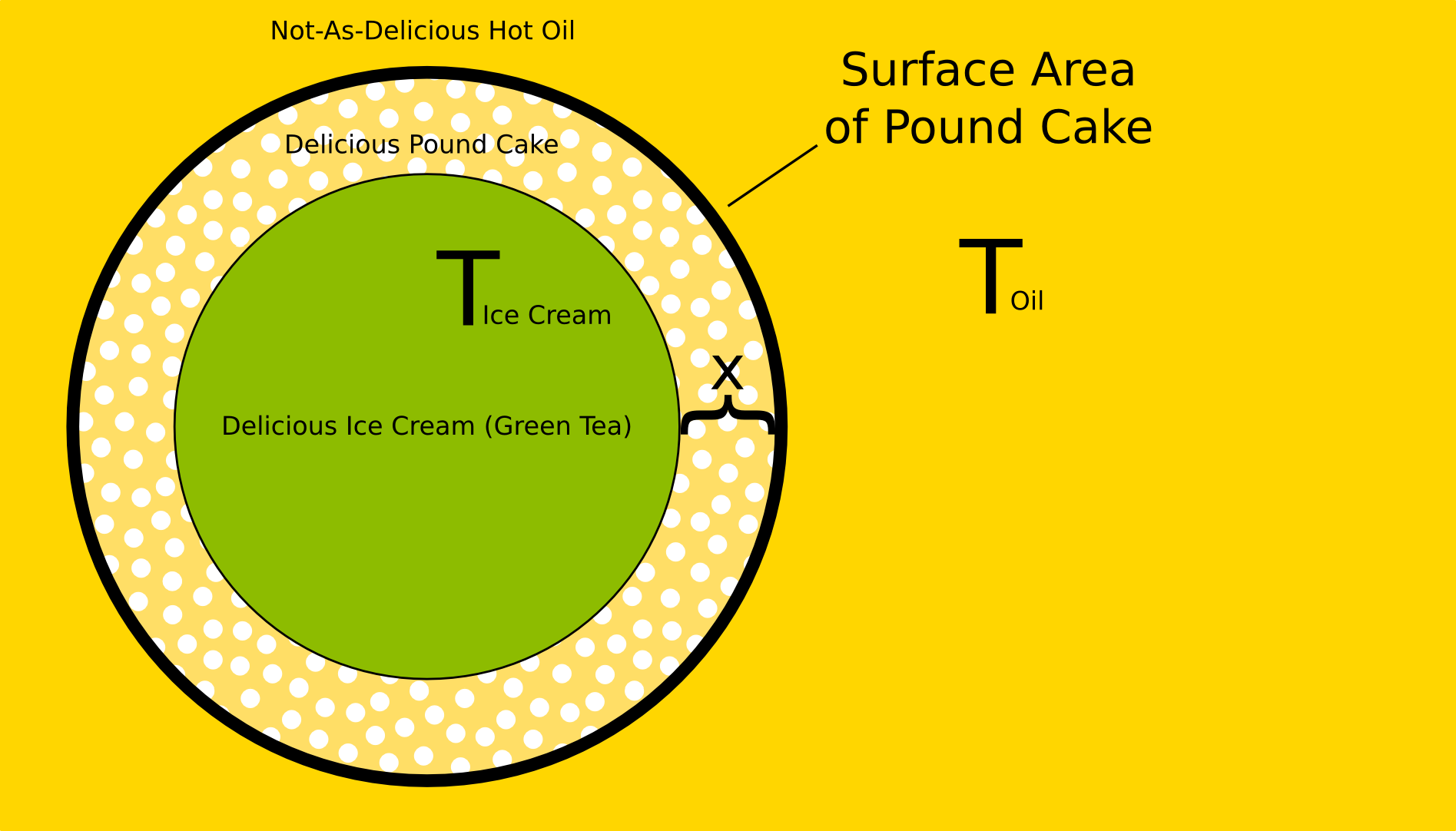 For our deep fried ice cream, Fourier’s law translates thusly: the amount of heat transferred into the ice cream over the cooking period depends on the surface area of the pound cake barrier, temperatures of the ice cream and oil, thickness of the pound cake, and the thermal conductivity of pound cake.