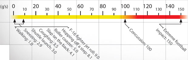 One way to measure the force of a tackle is with accelerometers that track the G force of a hit. G’s measure the acceleration of an object, and is equivalent to the acceleration due to gravity at the surface of the Earth. So, if you drop a football, it experiences 1 G on it’s way to the ground. If you throw a football with three times as much acceleration, you’d be subjecting it to 3 G’s. Launching the space shuttle also measures around 3 G’s but keep in mind that the rockets burn continuously, so don’t expect to throw a football into orbit. Executing a barrel roll in a fighter jet subjects the pilot to about 9 G’s over the course of the maneuver.