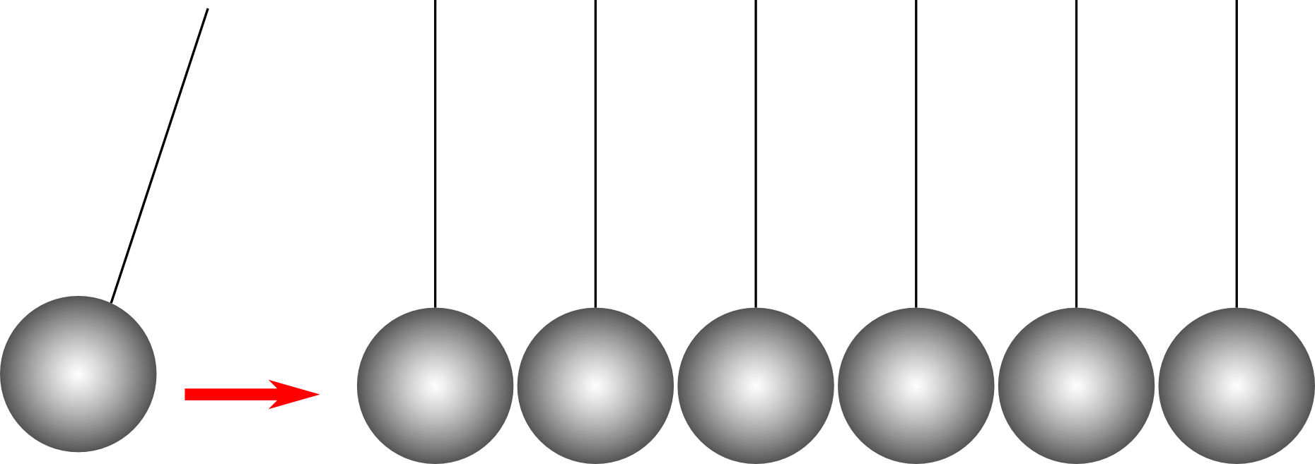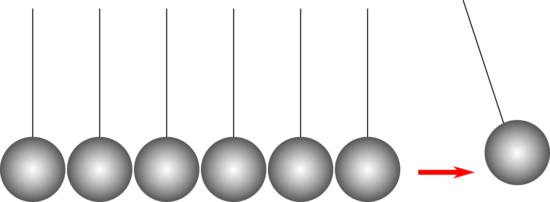 Collisions in physics are divided into two categories: elastic, and inelastic collisions. The thing that separates them is the conservation of kinetic energy. Elastic collisions conserve kinetic energy, so that the total kinetic energy before and after a collision is the same. We see this in the case of those swinging Newton’s Cradle toys. When one ball swings into the rest, the energy is transferred across the row and kicks out one ball on the other side, with the same speed that the incoming ball had. Similarly, when you swing two balls into the row, two balls are kicked out the other side at the same speed. This seemingly continues on forever, but it does slow down and stop eventually because SOME of the kinetic energy is converted into other types of energy – sound and heat for instance. For the most part though, the Newton’s Cradle is a very good approximation of elastic collisions.